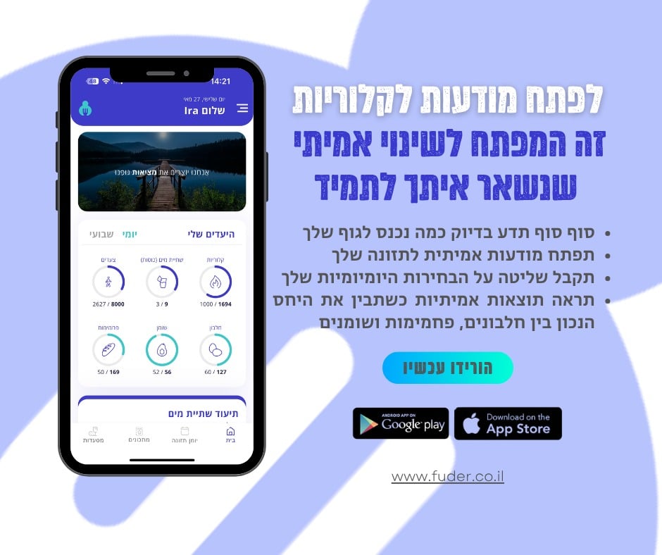 אפליקציית Fuder היא כלי שימושי למעקב אחר הרגלי תזונה וצריכת קלוריות הכולל מאגר גדול של מאכלים, מתכונים, יעדים, מספר הצעדים היומי ועוד.